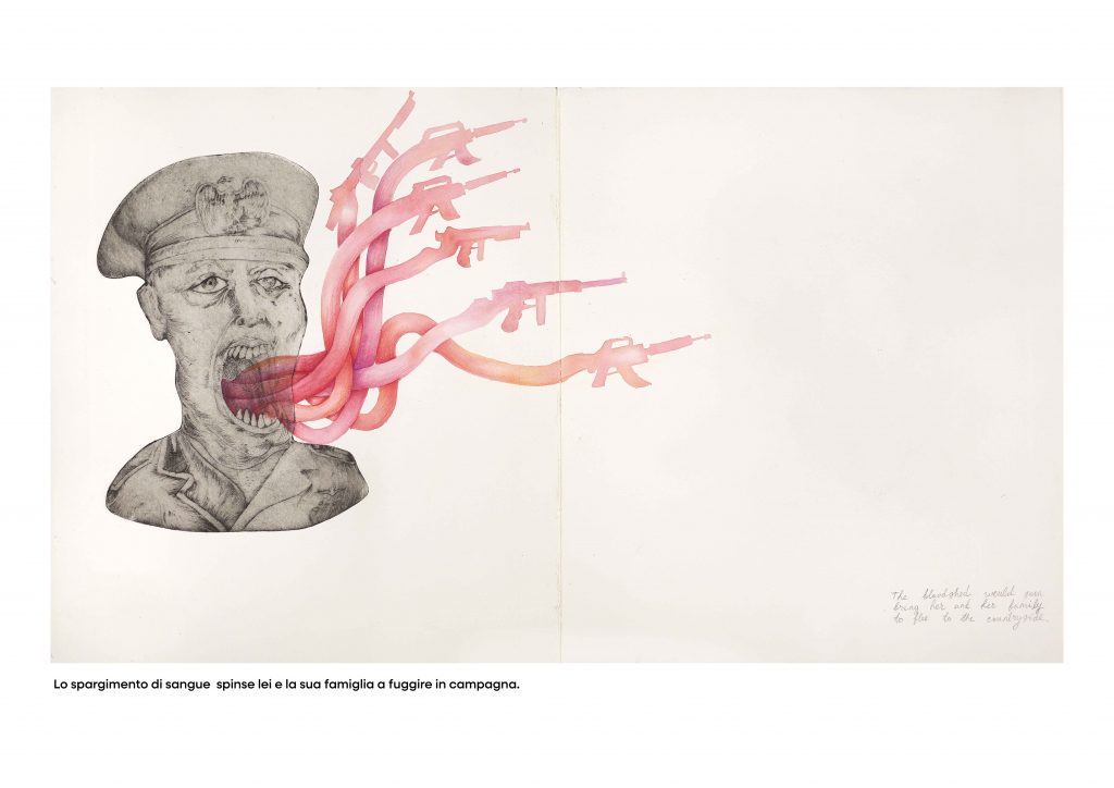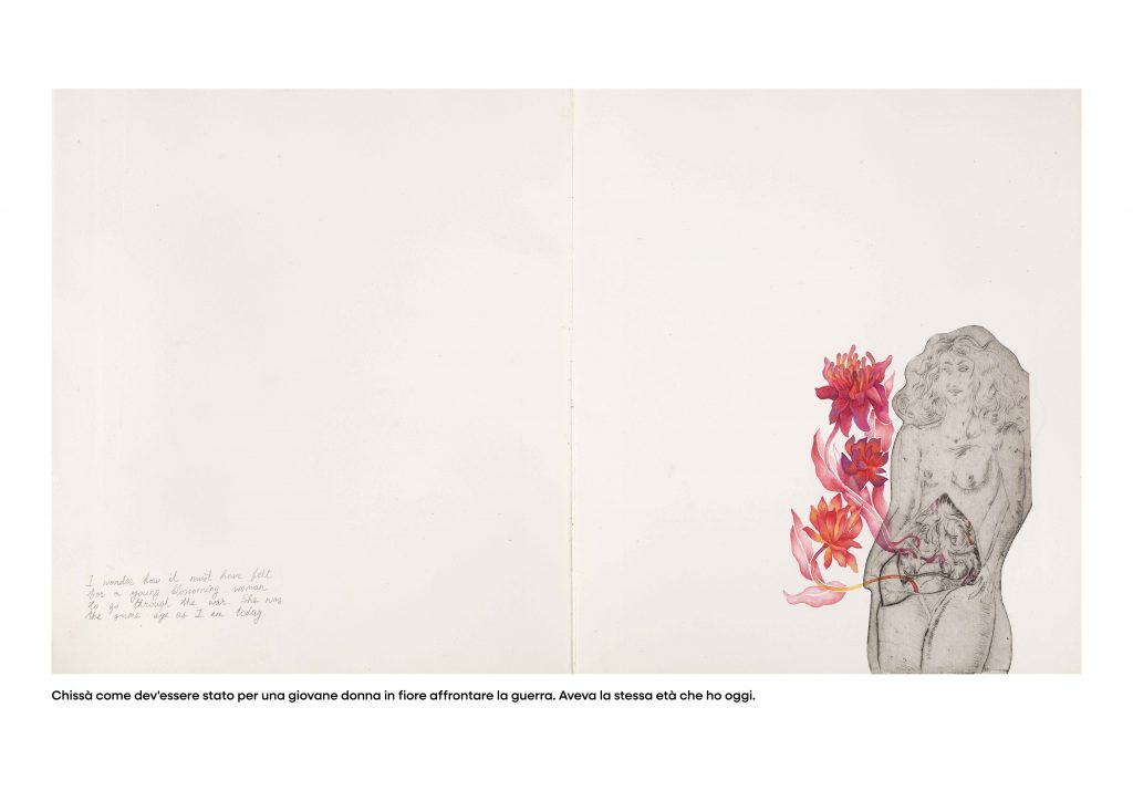A partire dalle memorie familiari Amélie crea un’intensa opera grafica che si interroga sul contrasto tra guerra e giovinezza, tra la mostruosa macchina della morte e il potente istinto alla vita. Sul segno severo dell’incisione (medium che  Amélie non ama usare abitualmente),  divampa il rosso che è sangue e fiore, morte e speranza, realizzato tuttavia con la delicatezza dell’acquarello (medium prediletto da Amélie.