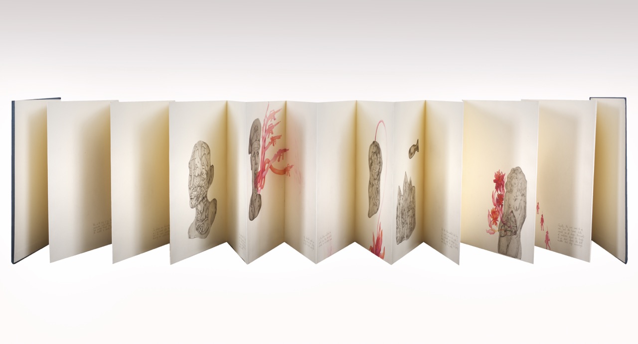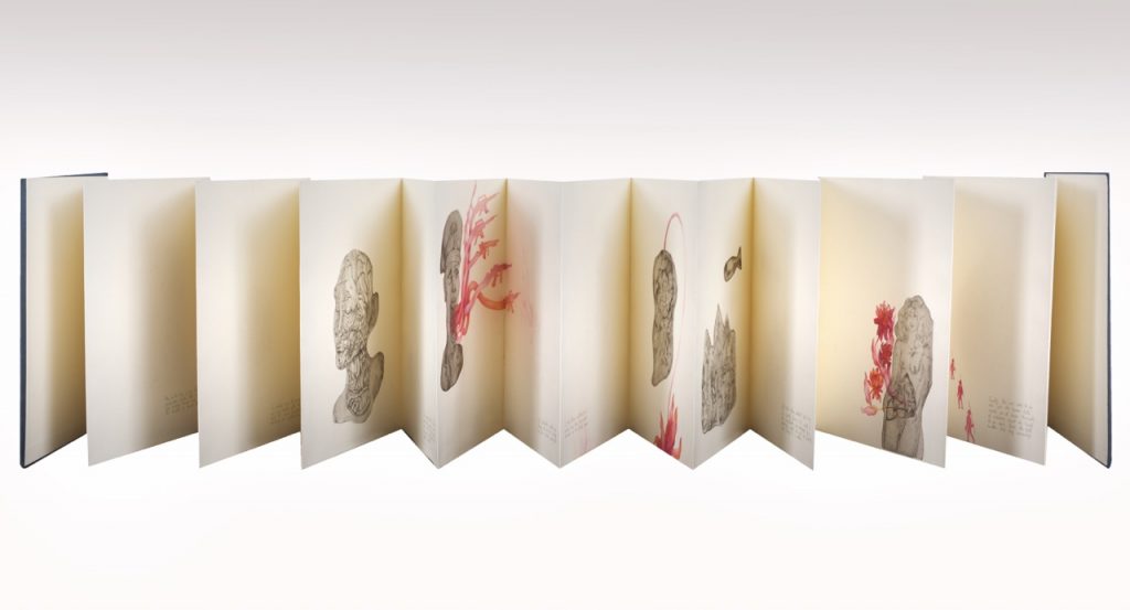 Leporello (libro a fisarmonica), esemplare unico con tirature BeN di 8 lastre sagomate, incisione a puntasecca, acquarello e penna su carta, libro chiuso 38 x 33 cm, libro aperto 38 x 660 cm arricchite con disegni all’acquarello e matita.