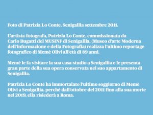 Nel 1974, Memè e Bino acquistano un appartamento a Parigi, in rue Jacob, nell’elegante quartiere di Saint-Germain-des-Prés. Memè lo utilizzerà come studio e base operativa per frequentare la città, ma non ne farà la sua dimora esclusiva. Da quel momento si dedicherà alla sua sperimentazione artistica, spostandosi tra Bruxelles, Roma, Parigi e Senigallia. Nonostante il suo costante viaggiare, Memè vive il ricordo della sua terra natale con profonda nostalgia. Ogni estate torna sulla costa adriatica, a Senigallia, assaporando quell’atmosfera bucolica e intima che le sue opere trasmettono in modo così efficace. Eppure la sua arte è in grado di andare oltre la mera rappresentazione, cogliendo l’essenza poetica della realtà in tuto il suo splendore. Come afferma lo scrittore Franco Foschi nel catalogo della mostra di incisioni di Memè Olivi a Recanati, “Chi nasce nelle Marche, porta dentro di sé l’immagine di un paesaggio dolce che si apre verso spazi indefiniti, ma solo un’artista vera, che conosce la pazienza delle tecniche antiche, può esprimere in una grafia che parla anche a chi non conosce il linguaggio dell’arte, ciò che si vede solo con gli occhi dell’anima”5.