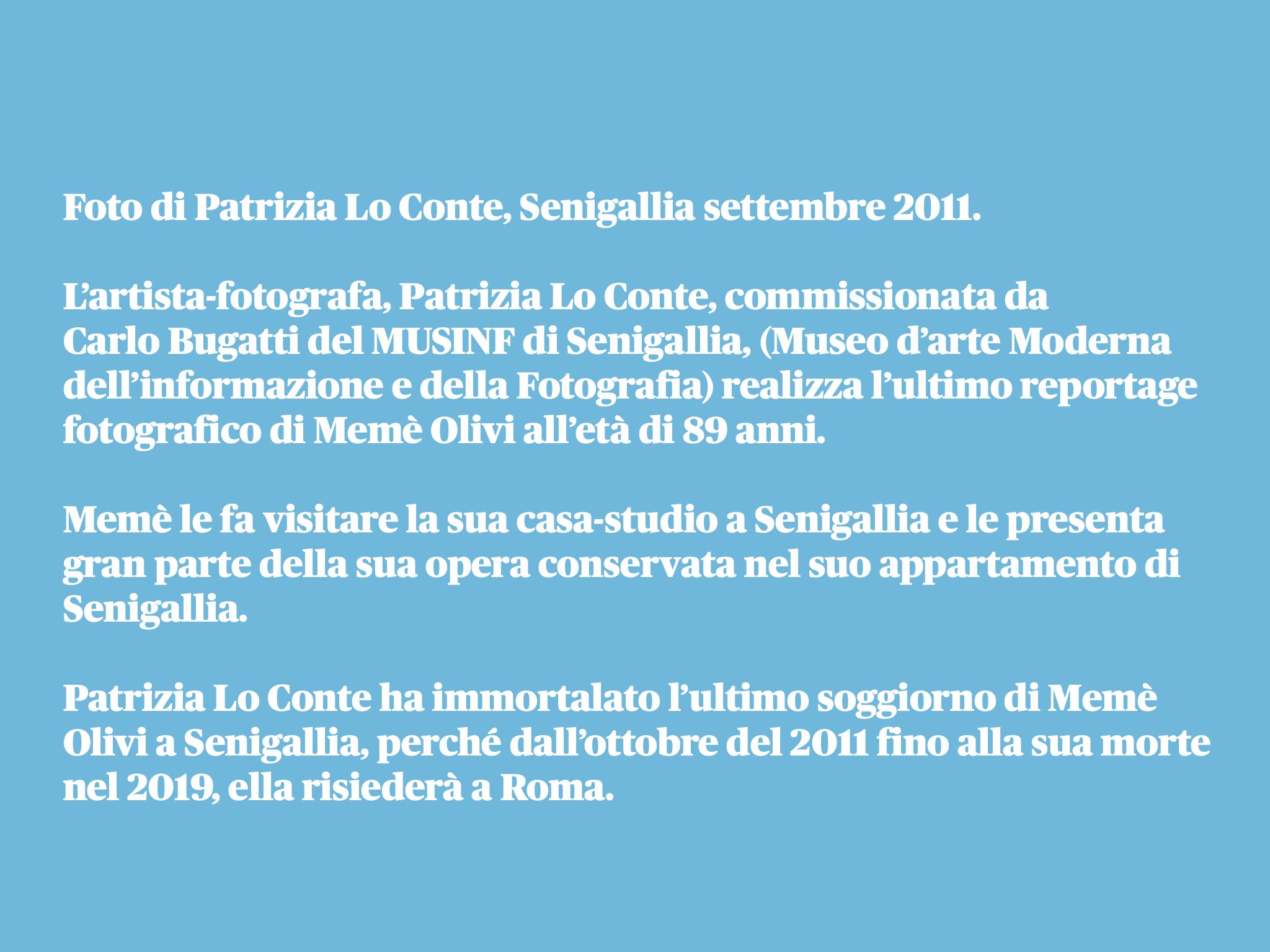 Nel 2010, a causa dell’infermità del marito, Memè Olivi torna in Italia e si stabilisce definitivamente a Roma. Muore nella stessa città il 28 settembre 2019, all’età di 97 anni.