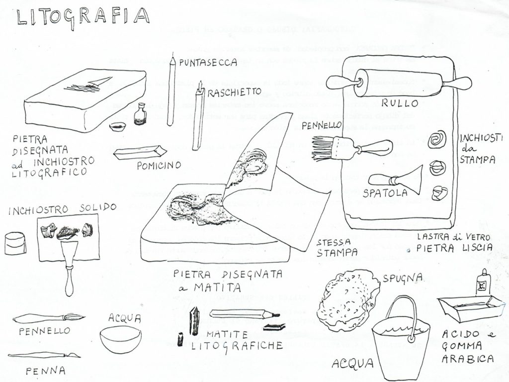 Viene usata la pietra calcarea che è in grado di assorbire le materie grasse. Il disegno viene tracciato sulla pietra con una matita litografica grassa o con inchiostro litografico grasso. Si stende su tutta la superficie una soluzione a base di gomma arabica, acido nitrico e acqua. La soluzione corrosiva non agisce sulle materie grasse e lascia le linee del disegno perfettamente lisce e pronte per esser inchiostrate mentre l’inchiostro non ha presa sulla superfice della pietra pura. L’inchiostro viene distribuito con un rullo, mentre la pietra è mantenuta umida con dell’acqua. Per ogni stampa la pietra deve essere inchiostrata di nuovo. Per le stampe a più colori si usa una pietra diversa per ogni tinta, stampando sullo stesso foglio prima i colori chiari e via via le pietre con il colore forte, stando bene attenti a far combaciare alla perfezione i punti di riferimento.
